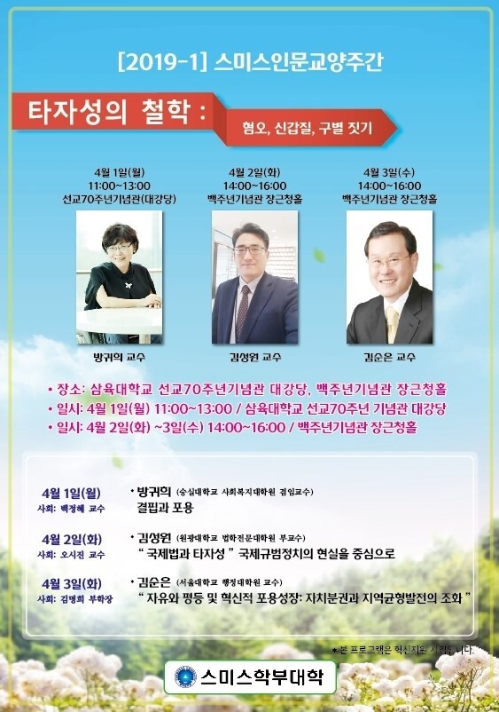[대학저널 오혜민 기자] 삼육대학교(총장 김성익) 스미스학부대학(학장 김용성)은 4월 1일부터 3일까지를 ‘인문주간’으로 정하고 ‘타자성의 철학 : 혐오, 신갑질, 구별 짓기’라는 주제로 인문학 특강을 연다.