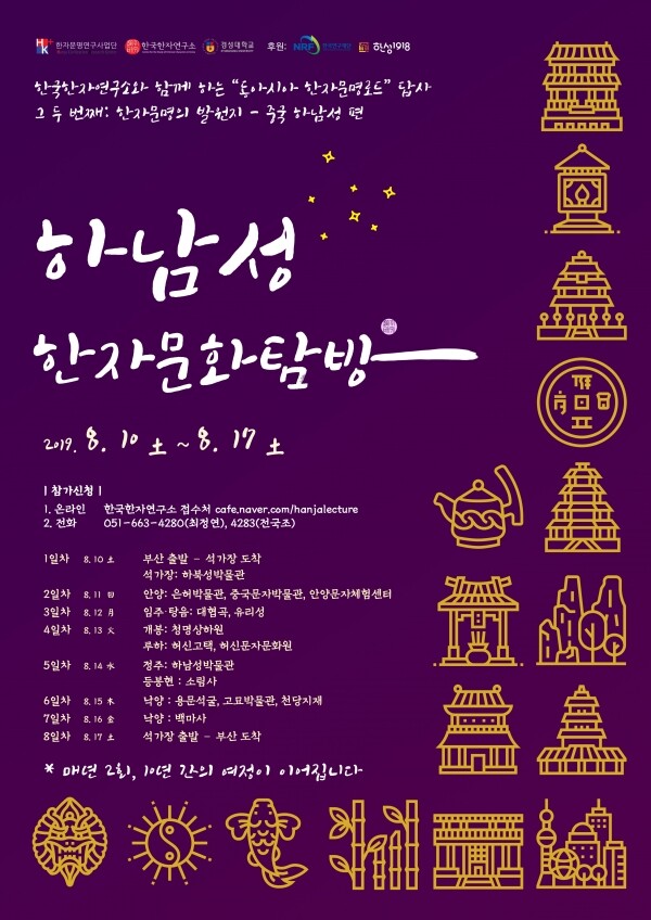 특히 안양은 중국 은나라(상나라)의 수도이자 중국 최초의 문자로 평가받는 갑골문자의 탄생지이며 세계적 규모의 중국문자박물관과 문자체험센터가 있는 곳이다. 또 중국 최초의 자전 ‘설문해자(說文解字)’를 지은 허신(許愼)의 고택과 허신문자문화원이 있는 루하 역시 한자문명로드에서 매우 뜻 깊은 곳이다. 전문가와 함께하는 이번 문화탐방을 통해 참가자들은 동아시아 한자문명의 도도한 흐름은 어떻게 발원했는지, 현시대로는 어떻게 이어지고 있는지를 볼 수 있다.
