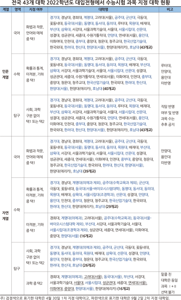 한국대학교육협의회는 대입포털 어디가에 지난 4월 30일 서울대·연세대(서울)·고려대(서울) 등 22개 대학과 9월 5일 동국대(서울)·서울시립대·한양대(서울) 등 21개 대학의 2022학년도 수능시험 국어·수학·탐구 영역의 선택 과목 지정 현황을 모아 ‘2022학년도 수능 지정 현황(2차)’으로 하여 10월 2일 공개했다. 전국 43개 대학의 2022학년도 수능시험 선택 과목 지정 현황을 계열별로 살펴보면 다음과 같다.