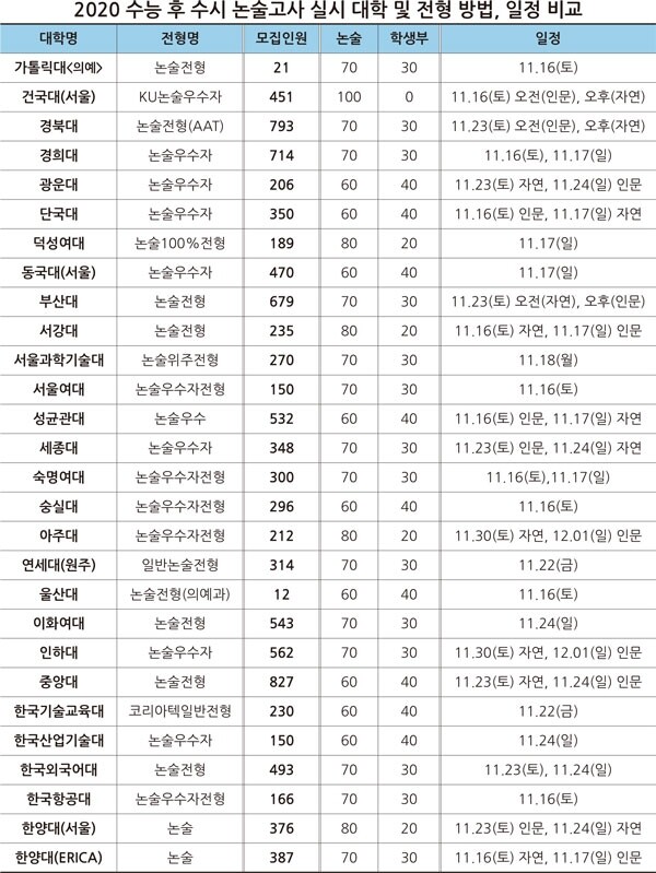 수능 다음 주인 11월 23일에 수시 논술고사를 실시하는 대학이 경북대, 광운대 자연, 부산대, 세종대 인문, 중앙대 자연, 한국외대, 한양대(서울) 인문 등 7개교이고, 11월 24일은 광운대 인문, 세종대 자연, 이화여대, 중앙대 인문, 한국산업기술대, 한국외대, 한양대 자연 등 7개교이다.