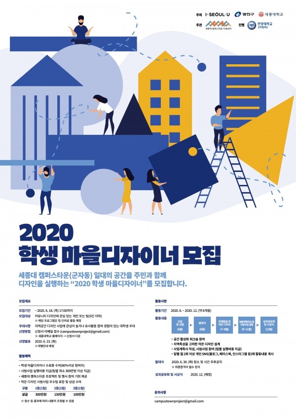 [대학저널 신효송 기자] 세종대학교(총장 배덕효) 캠퍼스타운은 ‘2020 학생 마을디자이너’를 모집한다.