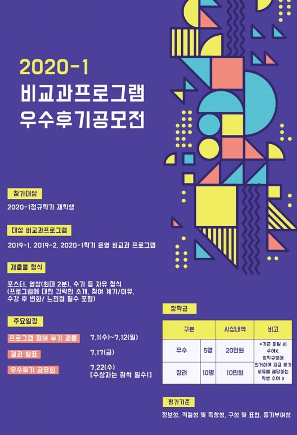 공모 내용은 직접 참여한 비교과 프로그램 후기이다. 2019년 1, 2학기와 2020년 1학기 중 참여한 비교과 프로그램 경험에 대해 자유롭게 작성하면 된다.