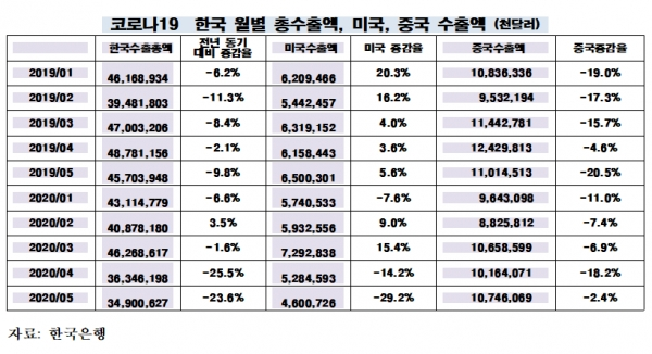 코로나19가 가장 심각했던 2020년 5월 한국 총 수출액은 349억 달러로 2019년 5월 457억 달러보다 24% 감소했다. 2020년 5월 중국 수출액은 107억 달러로 전년 동기 110억 달러보다 2% 줄었다. 미국 수출은 2020년 5월 46억 달러로 전년 동기 65억 달러보다 무려 29% 감소했다. 코로나19로 인해 미국 수출액이 급감한 것을 알 수 있다.