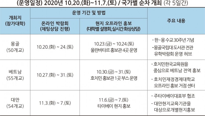 ‘2020 해외 한국유학박람회’(국가별 맞춤형 박람회)는 오는 20일부터 11월 7일까지 3주간 열린다. 개최 대상 국가는 한국유학 수요가 높고, 코로나가 비교적 안정적인 몽골, 베트남, 대만 등 3개국이다.