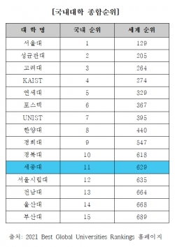 [대학저널 백두산 기자] 세종대학교(총장 배덕효)는 미국 시사주간지 US뉴스 앤드 월드 리포트(US News and World Report)가 최근 발표한 2021 세계대학순위(Best Global Universities Rankings)에서 국내 11위를 차지했다.