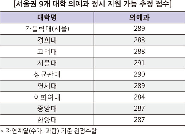 서울권 대학 중 의예과가 개설된 대학은 가톨릭대 등 9개 대학이다. 서울권 대학의 의예과 진학을 위해 필요한 2021학년도 가채점 기준 원점수는 287점 이상으로 예상된다.