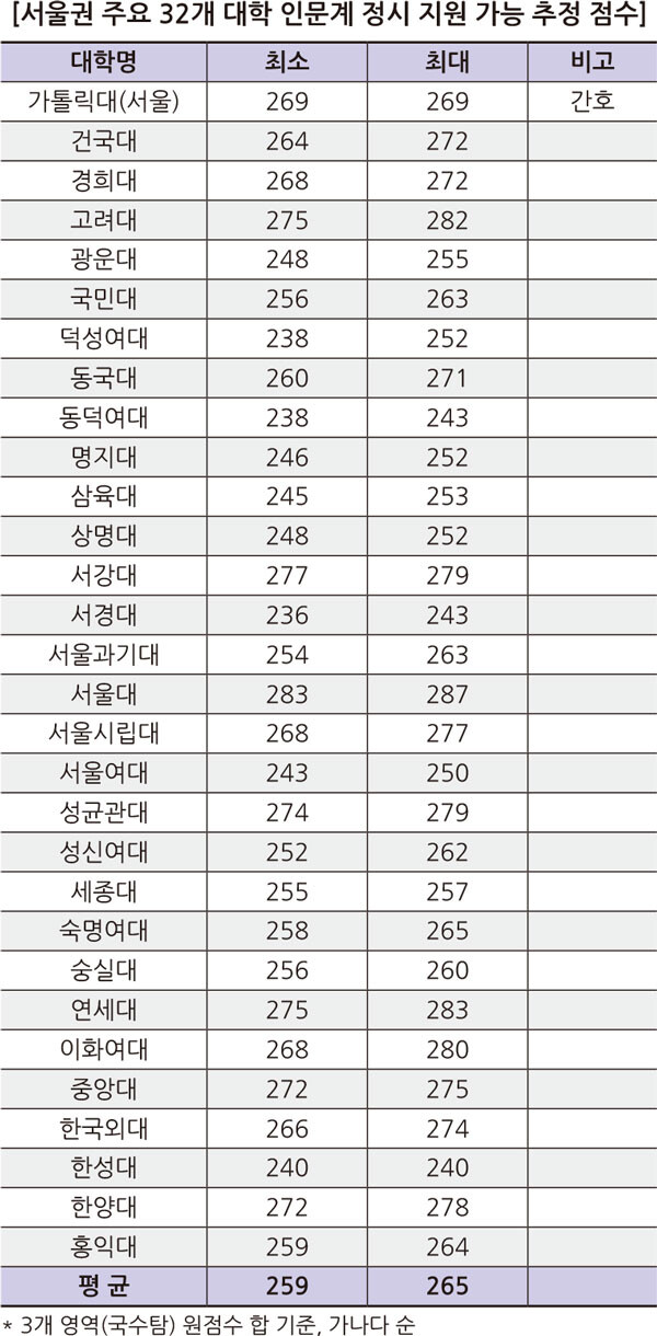 서울권 32개 대학 인문계 평균 259 ~ 265