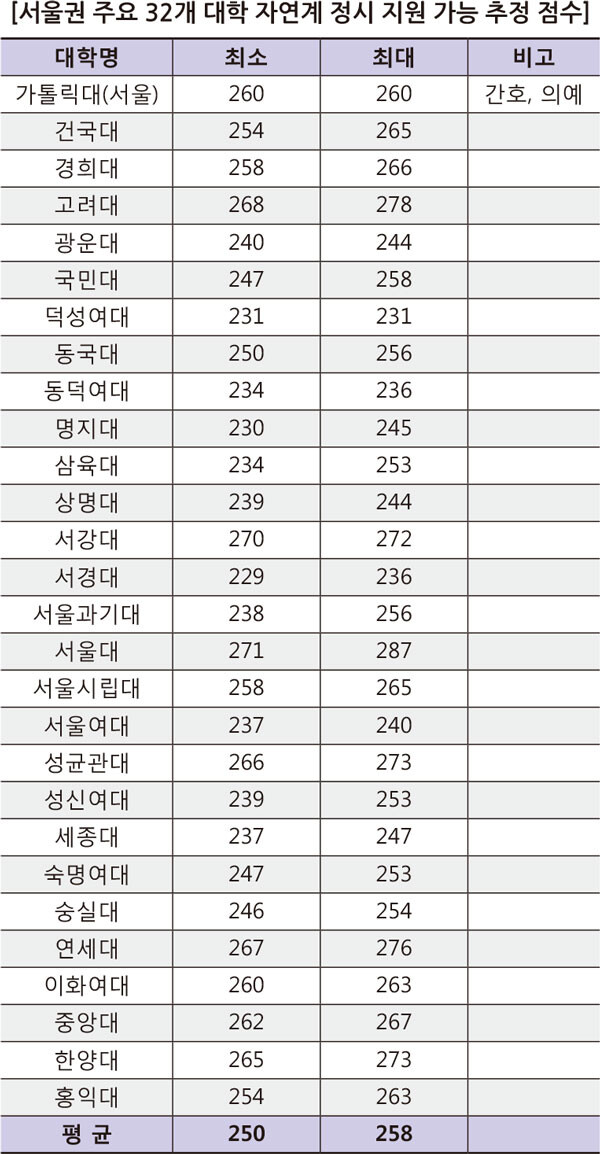 서울권 32개 대학 자연계열 모집단위의 지원 가능 점수는 다음과 같다.