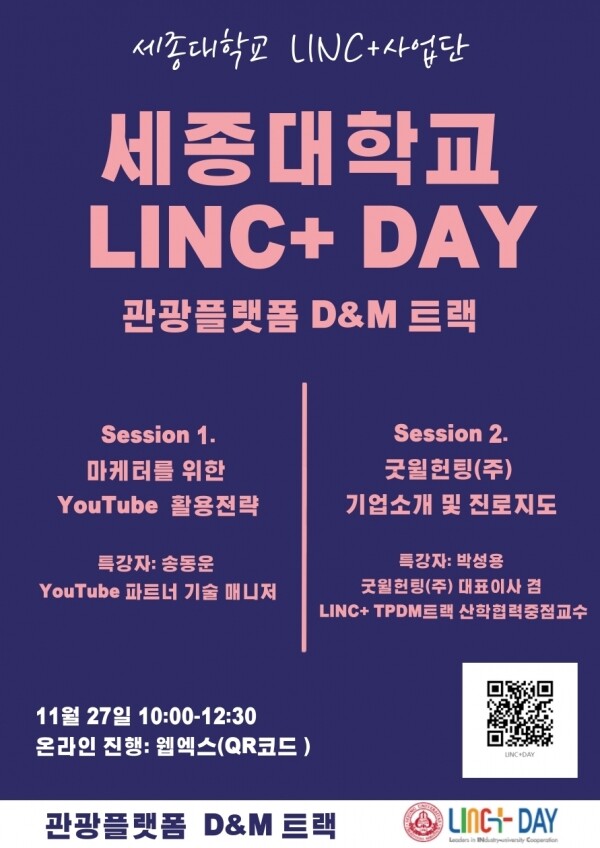 [대학저널 임지연 기자] 세종대학교(총장 배덕효) LINC+ 사업단 관광플랫폼 D&M(TPDM)트랙은 최근 진행된 LINC+ DAY 행사에서 ‘마케터를 위한 유튜브 활용 전략 특강’과 ‘굿윌헌팅(주) 기업설명회’를 가졌다.