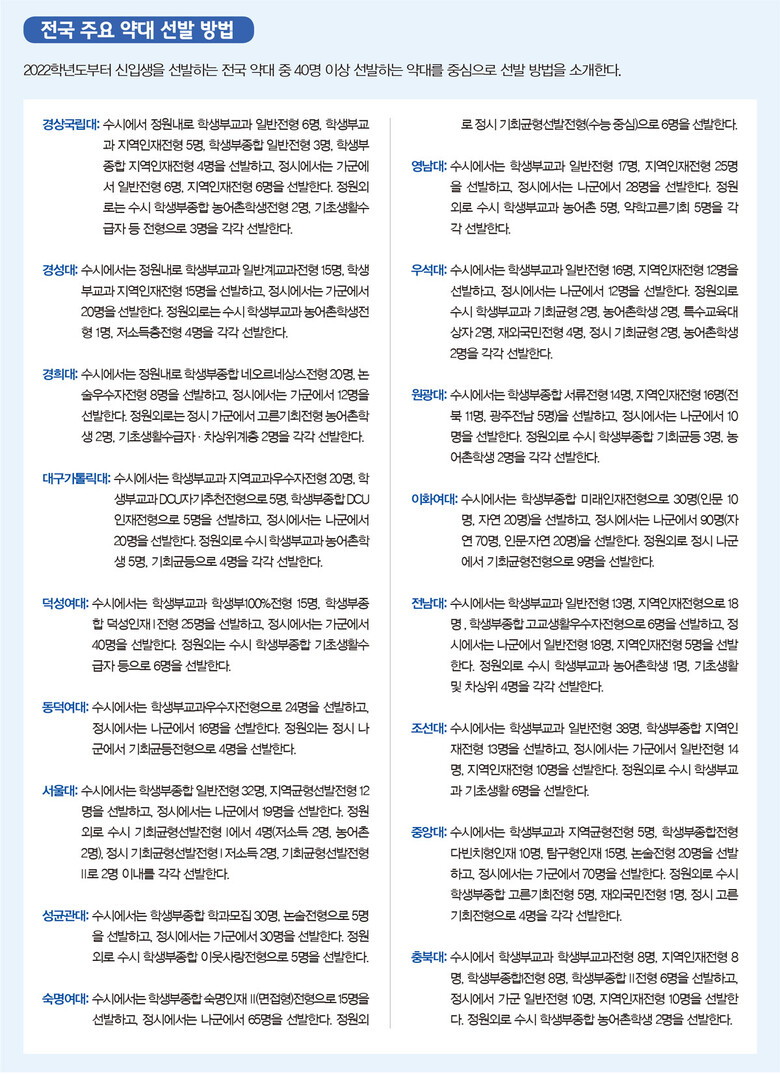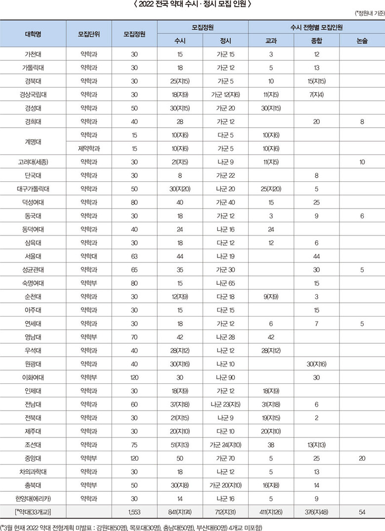 현재까지 발표된 ‘2022학년도 대학별 전형 계획’에 따르면 서울대(63명)와 중앙대(120명), 이화여대(120명), 성균관대(65명), 연세대(30명), 고려대(세종, 30명), 경희대(40명), 숙명여대(80명) 등 약대 33개 대학 모집정원은 1553명이다. 이 가운데 수시에서 전체 정원의 54.2%인 841명을, 정시에서 45.8%인 712명을 각각 선발한다.