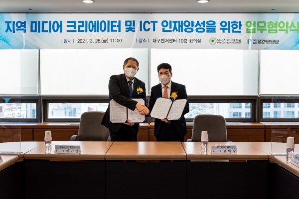 [대학저널 임지연 기자] 대구사이버대학교(총장 이근용)가 대구테크노파크와 협약을 맺고 지역 미디어 크리에이터 인재양성과 ICT 산업 공동 연구에 나섰다.
