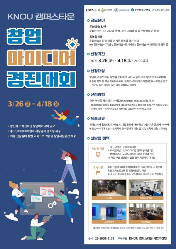 [대학저널 김주원 기자] 방송통신대학교(총장 류수노)는 서울 종로구와 함께 추진 중인 KNOU 캠퍼스타운사업 프로그램으로 창업아이디어 경진대회를 연다고 12일 밝혔다.