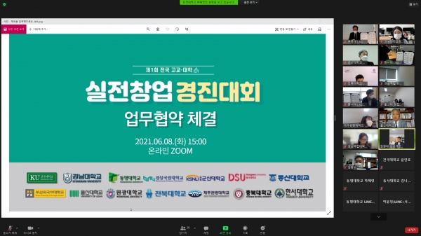 [대학저널 임지연 기자] 경남대학교(총장 박재규)는 LINC+사업단이 지난 8일 온라인 ZOOM을 통해 전국 14개 대학과 ‘전국 고교·대학 실전창업 경진대회’ 업무협약’을 체결했다고 9일 밝혔다.