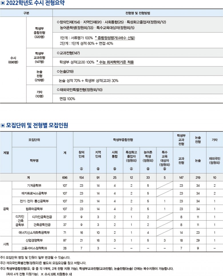 한국기술교육대는 2022학년도 수시에서 696명(77.7%), 정시에서 200명(22.3%)을 선발한다. 입학을 희망하는 학생은 세부전형(수시(학생부종합, 학생부교과, 논술), 정시(수능))과 전형별 반영비율을 고려해 자신에게 유리한 전형을 선택하되, 수시는 전형별로 최대 4개까지 복수지원할 수 있다.