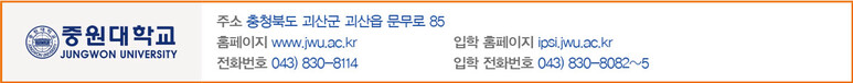 중원대학교는 ‘공부하기 좋은 대학, 내가 선택한 대학, 장학금 많이 주는 대학’입니다. 자연 녹지율이 캠퍼스의 약 70%를 차지하고 늘 푸른 자연의 색을 눈과 마음에 담을 수 있어 안정적인 공부 환경을 제공하고 있습니다. 또한 도시와의 거리로 인해 학습에 방해되는 요소들이 최소화돼 있습니다.