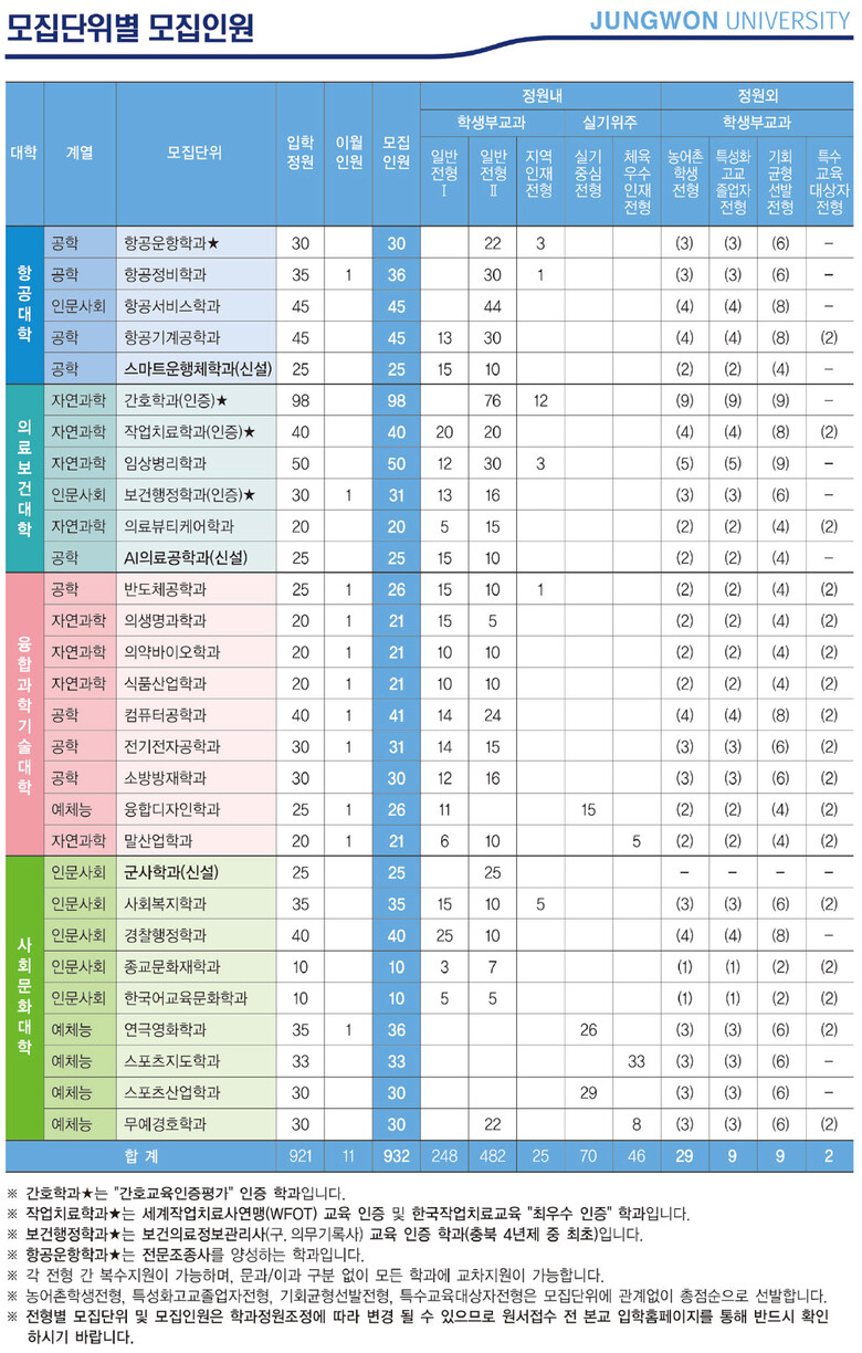 가장 크게 변경된 것은 첨단학과 2개 신설과 중원대가 위치한 괴산 지역을 문무의 메카로 만들기 위해 군사학과를 신설하는 것이다.