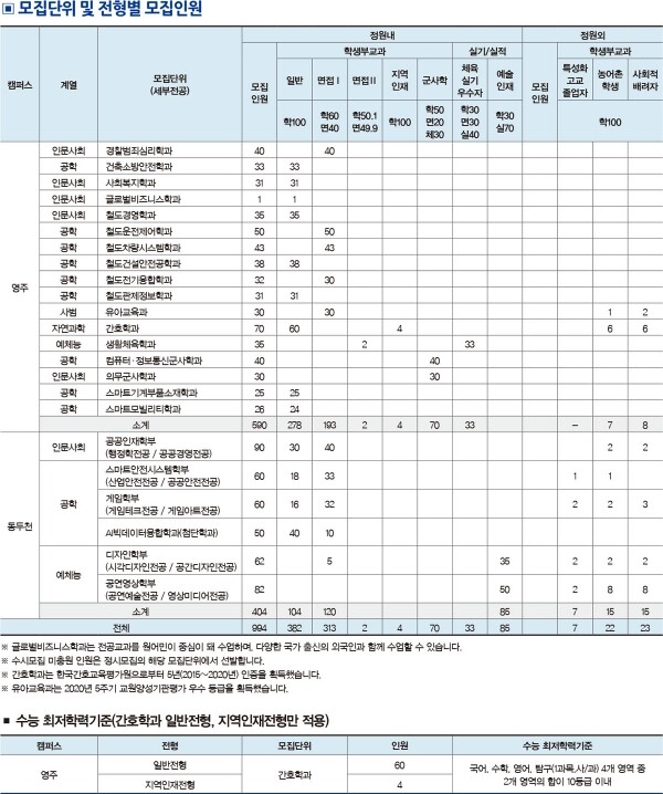 수능 최저학력기준은 간호학과(정원내 전형)만 적용되며 국어, 수학, 영어, 탐구(1과목) 4개 영역 중 2개 영역 합 10등급 이내 기준을 충족해야만 최종합격 처리된다.