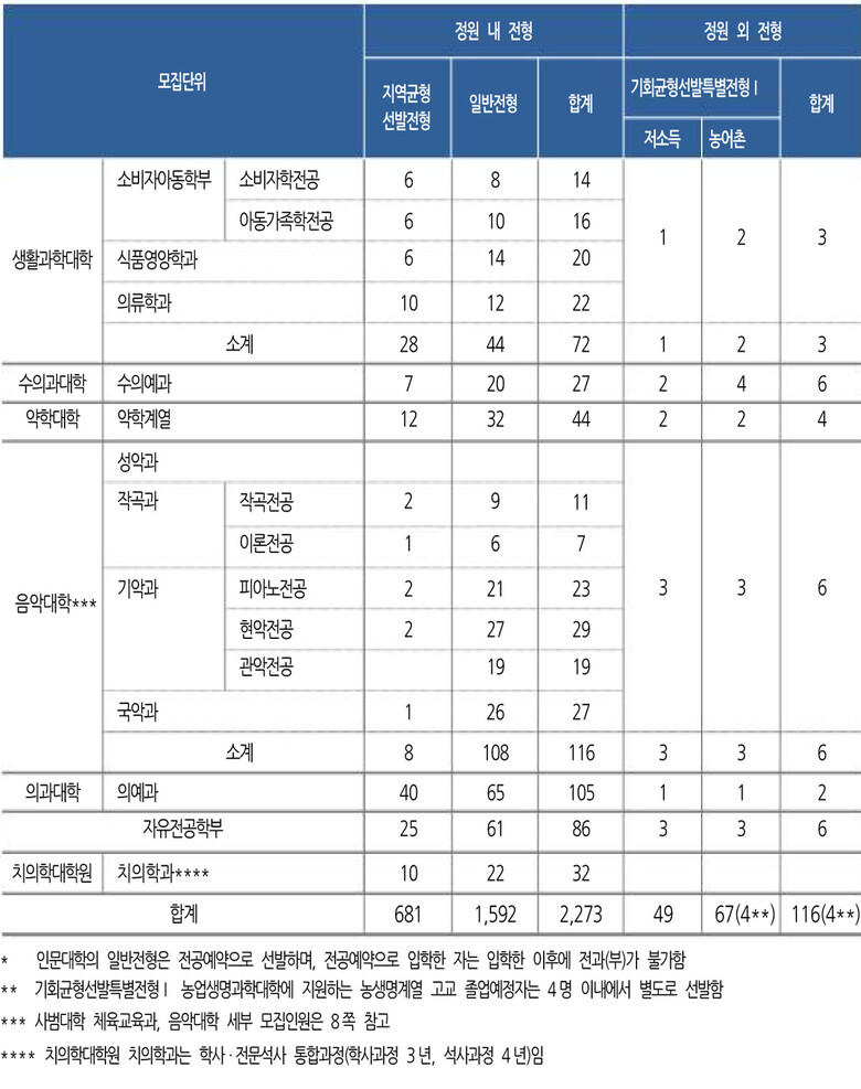 서울대학교(총장 오세정)가 2022학년도 입시에서 수시모집 학생부종합전형으로 2211명(69.7%), 정시모집 대학수학능력시험 위주 전형으로 960명(30.3%) 등 총 3171명(정원 외 제외 기준)을 뽑는다.