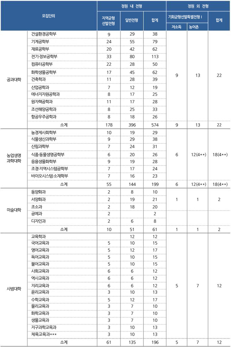 전형방법은 미대 음대 사범대를 제외한 나머지 모집단위에서는 1단계 서류 100%로 2배수 선발, 2단계에서 1단계 50%와 면접및구술고사 50%를 합산한다. 사범대는 서류 100%로 2배수를 선발하는 것은 동일하지만 1단계 성적 50%와 면접및구술고사 30%+교직적성/인성면접 20%를 합산한다. 미대와 음대의 경우 모집단위에 따라 서류평가/실기평가/면접및구술고사 등의 반영비율에 차이가 있다.