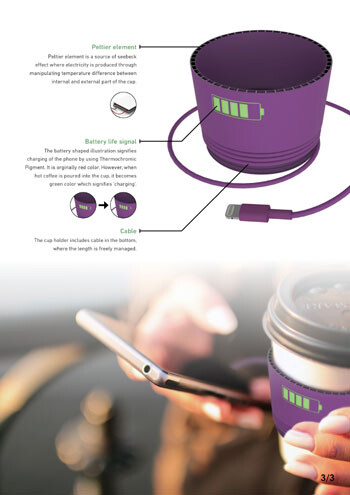 이 씨의 작품은 버려지는 커피컵홀더의 양을 줄여주는 ‘친환경적인 제품’ 이라는 점과 이용자가 홀더 외부에 프린트 되어있는 시온안료를 통해 컵 내부 열의 전력 생산량을 손쉽게 알아볼 수 있다는 점이 높게 평가받았다.