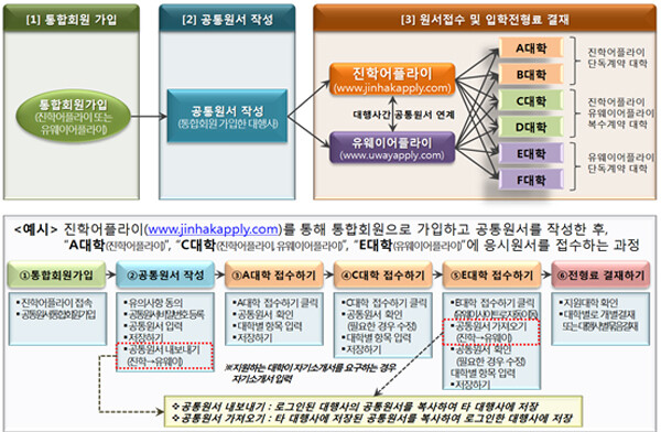 대교협 관계자는 "사용자 컴퓨터 환경에 따라 '표준 공통원서 접수시스템' 접속이 원활치 않을 수 있기 때문에 수험생 컴퓨터에서 접속에 문제가 없는지 미리 확인할 필요가 있다"면서 "문제가 발생하면 원서접수 대행사 콜센터(진학어플라이 1544-7715 / 유웨이어플라이 1588-8988)로 문의, 도움을 받기 바란다"고 말했다.