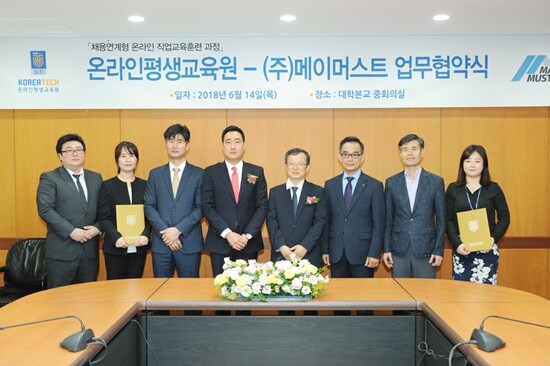 [대학저널 임승미 기자] 코리아텍(총장 김기영) 온라인평생교육원은 지난 14일 코리아텍 중회의실에서 (주)메이머스트(대표 박상현)와 ‘채용연계형 온라인 직업교육훈련 개발 및 운영’에 대한 상호협력을 골자로 한 업무협약을 체결했다.