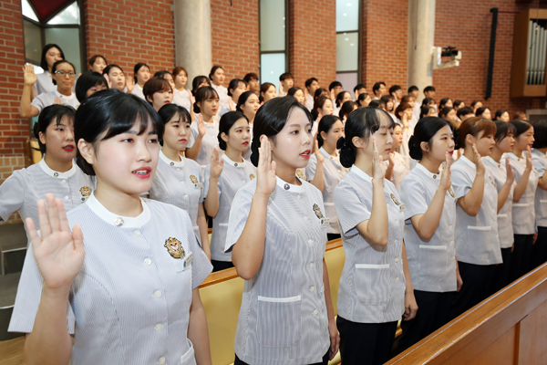 올해에는 임상실습을 앞둔 74명의 학생들이 나이팅게일 선서와 헌신가를 통해 간호사로서의 다짐을 되새겼다.