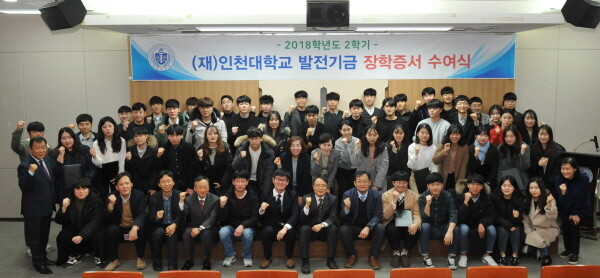 [대학저널 임지연 기자] 인천대학교(총장 조동성) 발전기금 재단은 지난 4일 인천대 송도캠퍼스 교수회관에서 ‘2018학년도 2학기 제2차 장학증서 수여식’을 개최했다.