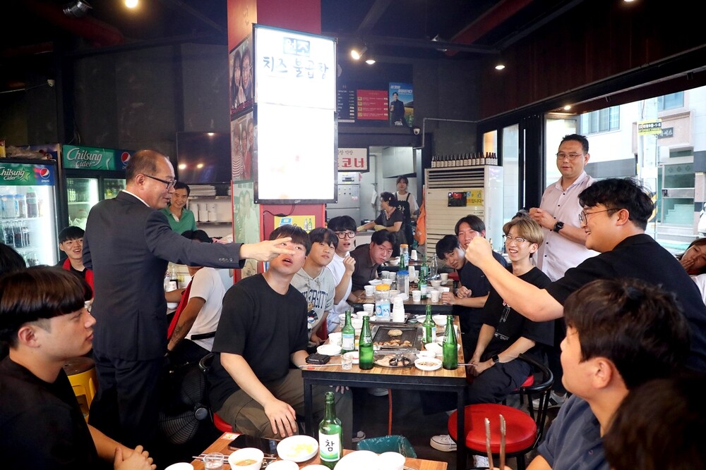 이재용 총장이 학생들과 '총장을 이겨라' 이벤트를 진행하고 있다. 사진=영남이공대 제공 |