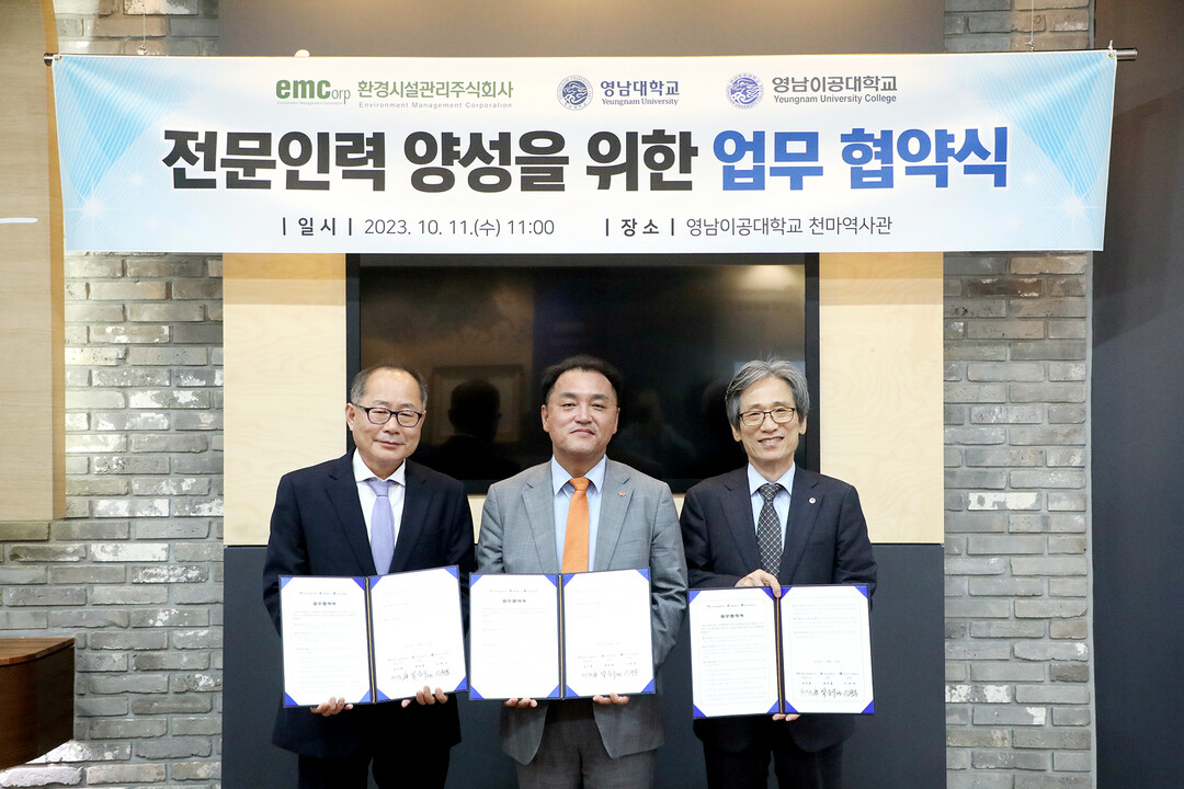 협약식을 통해 환경시설관리(주)는 환경 분야의 청년 일자리 창출을 위한 산·학 프로그램에 적극 협력하고, 영남대학교와 영남이공대학교는 환경 전문인력 양성을 위한 교육과정 개발 및 운영, 기술 자문 등에 적극 협력하기로 했다.