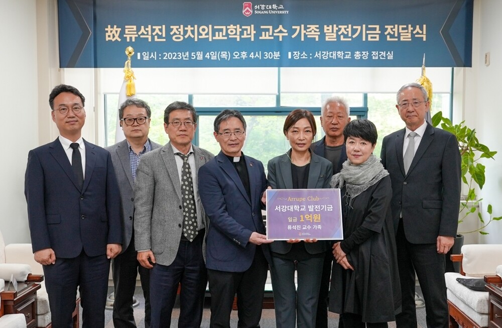 서강대가 4일 故 류석진 정치외교학과 교수 유가족의 기부금 전달식을 진행했다. 사진=서강대 제공 |