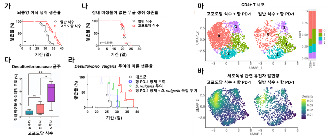 이번 연구에서 연구팀은 고 포도당 음료와 특정 균주의 복합처리가 뇌종양 내 면역세포 중 T 세포, 특히 CD4+ T 세포의 아형에서 세포독성 기능이 증대되는 것을 단일 세포 전사체 분석을 통해 확인했다.