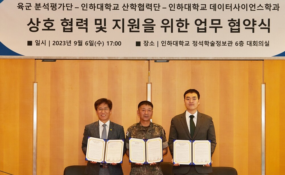 왼쪽부터 김주형 인하대 산학협력단장, 조용주 육군 분석평가단장, 박보용 인하대 데이터사이언스학과장이 상호협력·지원을 위한 업무협약식에서 기념사진을 촬영하고 있다. 사진=인하대 제공 |