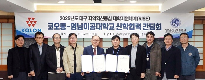 영남이공대가 4일 코오롱인더스트리와 지역혁신중심 대학지원체계(RISE) 사업 연계 협약을 체결했다. 사진=영남이공대 제공 |