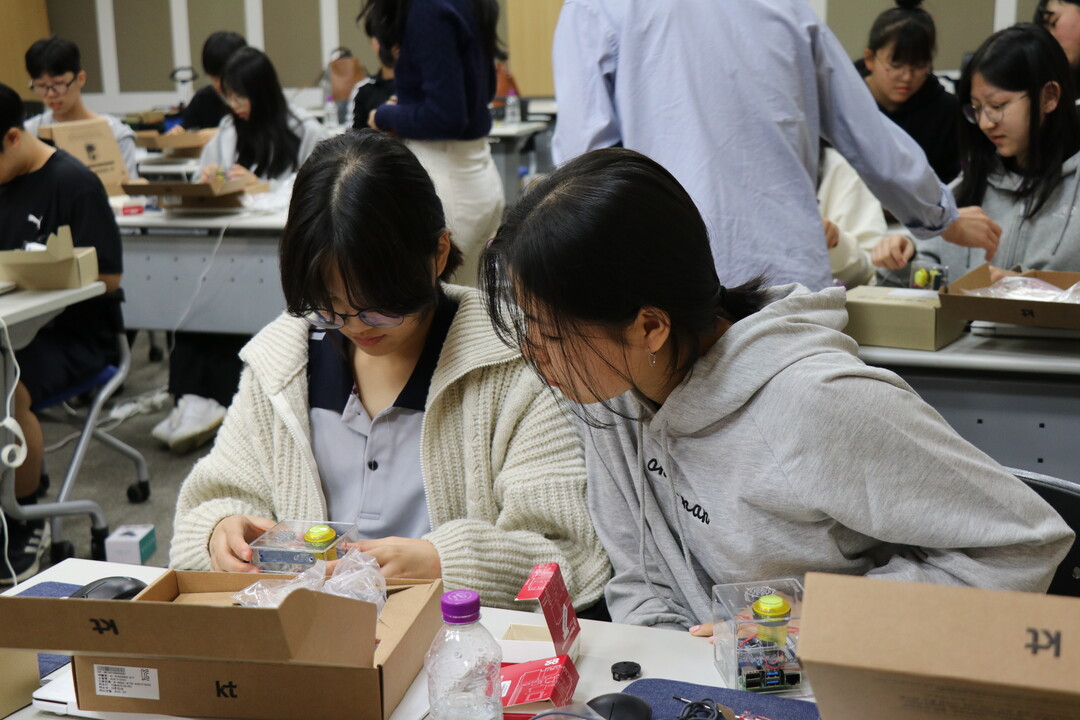 ‘AI KIT 제작 및 코딩 수업’에서는 학생들이 AI에 친근감을 가질 수 있도록 평소 쉽게 접할 수 있는 인공지능 스피커를 활용한 수업이 진행됐다. 학생들은 3시간에 걸쳐 직접 나만의 인공지능 스피커를 만들고 블록 코딩을 이용해 스스로 코딩까지 완성했다.