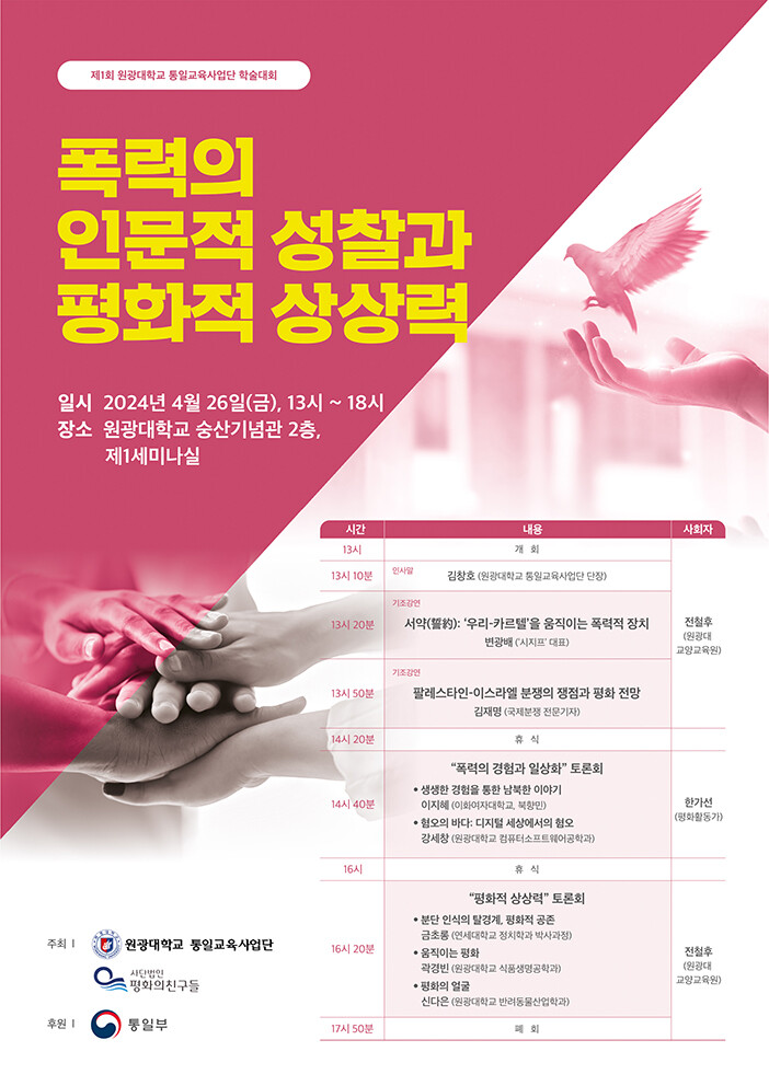 [대학저널 이선용 기자] 원광대학교 통일교육사업단이 ‘폭력의 인문적 성찰과 평화적 상상력’를 주제로 26일 교내 숭산기념관 제1세미나실에서 첫 번째 학술대회를 개최한다.