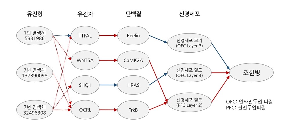 이도헌 교수 연구팀은 미 스탠리연구소의 다수준 뇌 조직 데이터에 최근 주목받는 인공지능 기술인 `설명가능한 심층학습' 기술을 접목해, 선천적 유전형과 조현병 사이의 병리를 설명하는 인공신경망 모델을 구축했다. 그리고 모델을 해석하여, 선천적 유전형이 유전자·단백질 발현 조절을 통해 뇌의 전전두엽피질, 안와전두엽피질 신경세포의 발생을 변화시켜 조현병 취약성을 결정한다는 사실을 밝혀냈다.