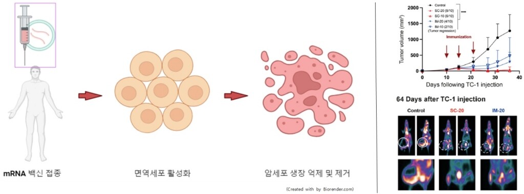 왼쪽은 mRNA HPV 치료 백신의 작용 원리. 오른쪽은 자궁경부암 세포를 실험용 쥐에 이식한 후 국내 기술로 개발된 mRNA HPV 치료 백신을 접종한 결과이다. 실험용 쥐에서 자라던 암의 크기가 줄어들거나 완전히 사라짐을 암의 부피 변화, PET 단층 촬영기법으로 확인했다. |