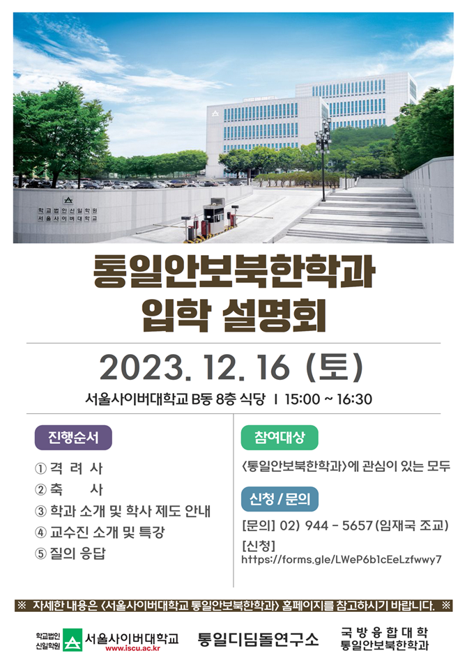 또한 2024학년도 학과 개편에 따라 통일안보북한학과에 관심이 있는 모든 이를 대상으로 16일, 서울사이버대에서 오프라인 입학설명회가 개최된다. 입학설명회 이후에는 남·북 대학생 연합 MT가 진행된다. 참가 신청은 서울사이버대 통일안보북한학과 홈페이지에서 가능하다.