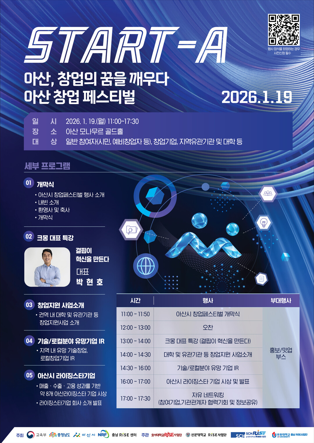 이번 행사는 지역 내 예비창업자와 초기 창업기업을 발굴하고 창업 친화적 환경을 조성해 지속 가능한 지역경제 성장을 도모하기 위해 기획됐다. 교육부와 충청남도, 아산시, 한국연구재단, 충남RISE센터가 주최하고 호서대학교와 순천향대학교 등 관내 4개 대학이 공동 주관한다.