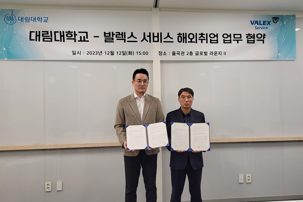[대학저널 온종림 기자] 대림대학교와 비즈니스 프로세스 아웃소싱(BPO) 전문기업 발렉스서비스가 지난 12일 대림대 국제교류원에서 졸업생들의 해외취업 진출을 지원하고 양질의 일자리 발굴 및 해외취업 정보 제공, 재학생, 졸업생 대상 해외취업 설명회 개최와 현지 생활정보 제공 등을 위해 협력관계를 구축하는 양해각서(MOU)를 교환했다.