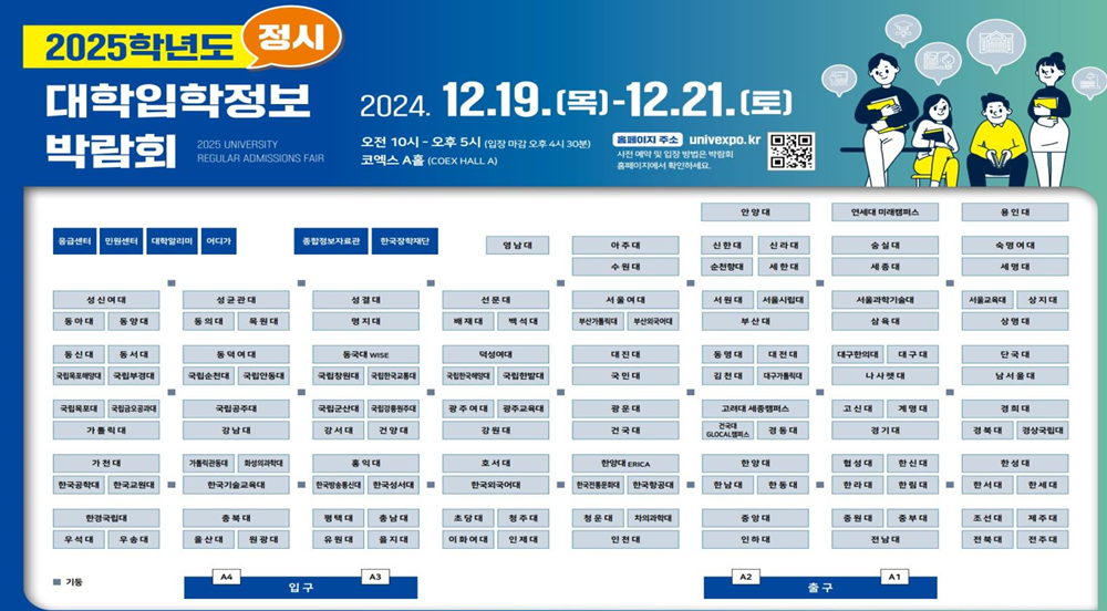[대학저널 온종림 기자] 한국대학교육협의회가 19일부터 21일까지 3일간 서울 삼성동 코엑스 1층 A홀에서 전국 133개 대학이 참가하는 ‘2025학년도 정시 대학입학정보박람회’를 개최한다.