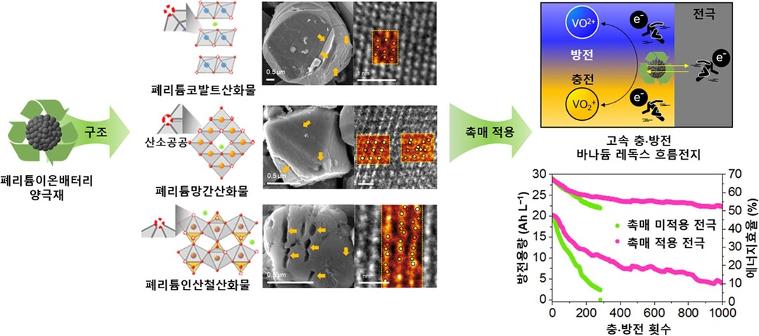 고 교수 연구팀은 전지의 성능을 높이기 위해 폐리튬이온전지의 양극재를 촉매로 사용했다. 쓴 것이다. 그 결과 폐리튬이온전지 양극재 특성이 반응물들의 산화환원 반응 시 저항을 크게 감소시켜 1,000회 이상 고속 충·방전을 가능하게 했다.