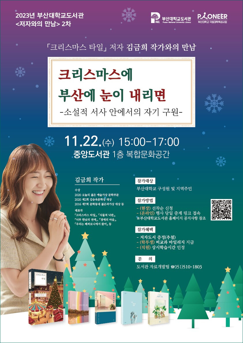 [대학저널 이선용 기자] 부산대학교 도서관이 11월 22일 오후 3시부터 교내 중앙도서관 1층 복합문화공간에서 ‘크리스마스에 부산에 눈이 내리면’을 주제로 김금희 작가를 초청해 <저자와의 만남> 행사를 개최한다.