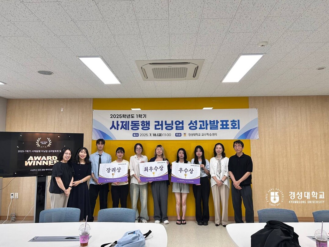 2025-1학기 사제동행 러닝업 성과발표회 수상자 및 참석자들이 기념촬영을 하고 있다. 사진=경성대 제공 |