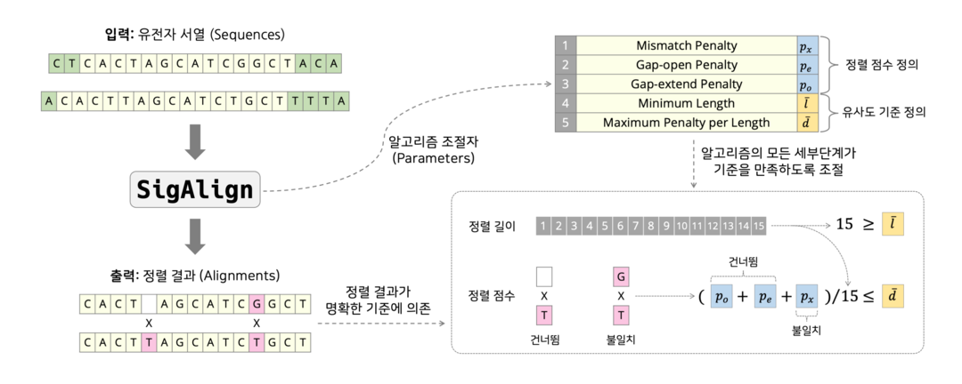 또 SigAlign은 기존 알고리즘들이 수십 개의 난해한 설정값 (parameter) 옵션들을 조정해야 되고, 이런 조정과정을 거쳐도 결과를 예측하기 어려운 단점을 획기적으로 극복해, 5개의 순수한 생물학적 설정값 (불일치 점수를 제외하면 단 2개의 설정값) 만으로 유전체 분석의 모든 과정과 결과를 투명하고 예측 가능하게 만들었다는 점에서 큰 관심을 받고 있다.