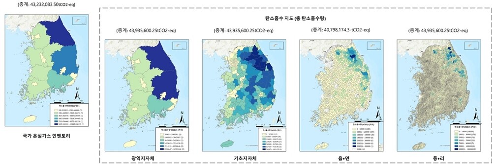 [대학저널 온종림 기자] 고려대학교 오정리질리언스연구원이 산림청의 스마트 산림경영 R&D를 통해 전국 광역 및 기초지자체, 읍·면, 동·리 행정단위까지의 탄소 흡수량을 파악할 수 있는 ‘탄소흡수지도(carbon sink map)’ 제작에 성공했다.