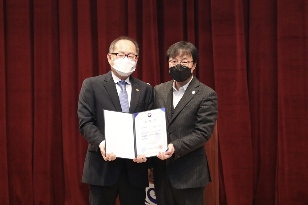 이재용 총장과 박만교 대외협력부총장이 표창장을 들고 기념사진을 촬영했다. |