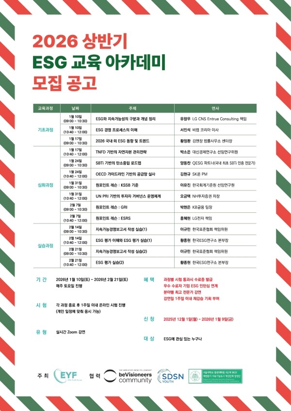 [대학저널 박종혁 기자] ESG Youth Forum이 한국ESG인재개발원과 ESG 실무 역량을 갖춘 핵심 인재 양성을 목표로 ’2026 상반기 ESG 교육 아카데미’를 개최한다고 8일 밝혔다.