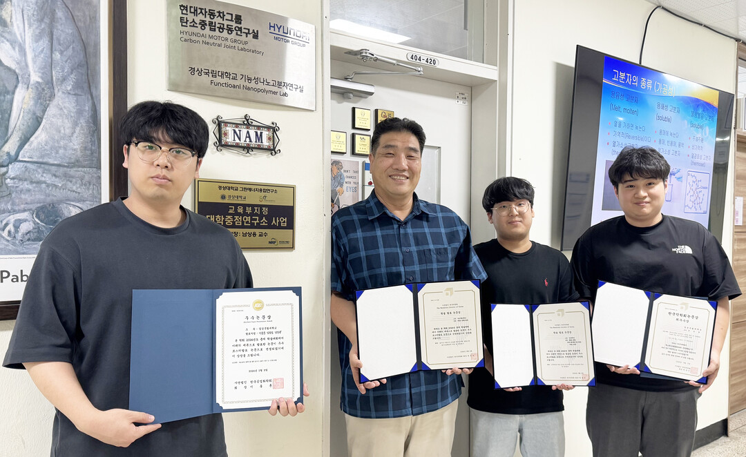 [대학저널 이선용 기자] 경상국립대학교는 대학원 나노신소재융합공학과 석사과정 권현웅, 박준호 씨가 5월 1~3일 수원에서 열린 ‘2024년 춘계 한국막학회’에서 학술발표논문상을, 석사과정 권현웅, 박준호, 이동준 씨가 5월 8~10일 부산에서 열린 ‘2024년 춘계 한국공업화학회’에서 우수논문상을 수상했다고 21일 밝혔다.